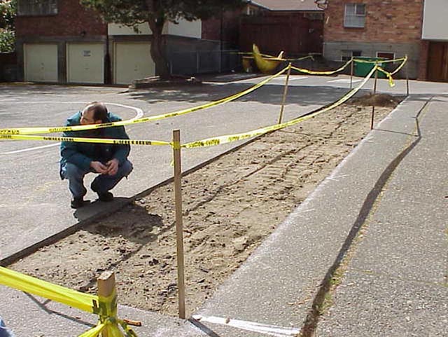 Examining the soil following asphalt removal.