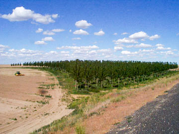 Hybrid poplar trees line the perimeter of a circle irrigation field.
