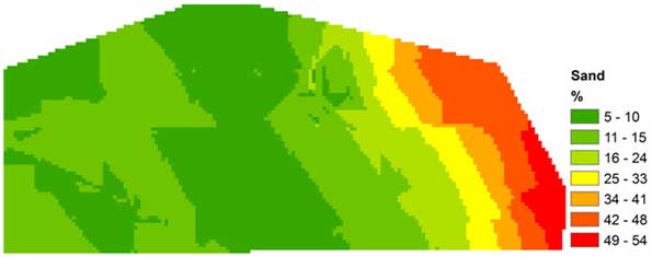 Soils within the area of the farm sampled varied greatly in texture. There was a strong gradient of increasing sand and decreasing clay from west to east. Sand ranged from 5-54 % while clay ranged from 9-27%. Four texture classes were identified: sandy loam, loam, silt loam, and silty clay loam.