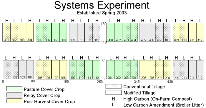 Single crops (outlined in red below) were grown the first three years of the experiment, including snap bean, fall spinach following summer cover, and winter squash. Beginning in 2006, each plot was planted to 4 rotation crops each year, with one bed having two consecutive crops. Crops included snap bean, winter squash, broccoli, and lettuce. In 2011 and 2015 winter wheat was grown in the relay and post harvest plots to break up disease cycles. Pasture plots were in pasture 1 year followed by 1 year of vegetable cropping prior to 2007, then 2 years of pasture followed by one year of vegetable cropping thereafter.